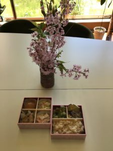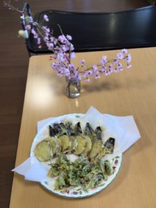 昼食は、お花見弁当(タケノコご飯と山菜の天ぷら‥)をご用意いたしました。季節の食事も大変好評でした。